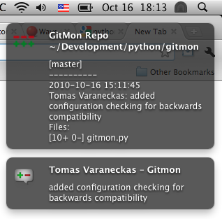 gitmon from terminal and it will create a default configuration file for you (~/.gitmon.conf). Edit it and you're good to go!Mac OS X users who have Growl installed can get it all working in 3 minutes. It will involve some additional configuration twiddling for Linux and Windows guys, but that will be improved in future releases.
